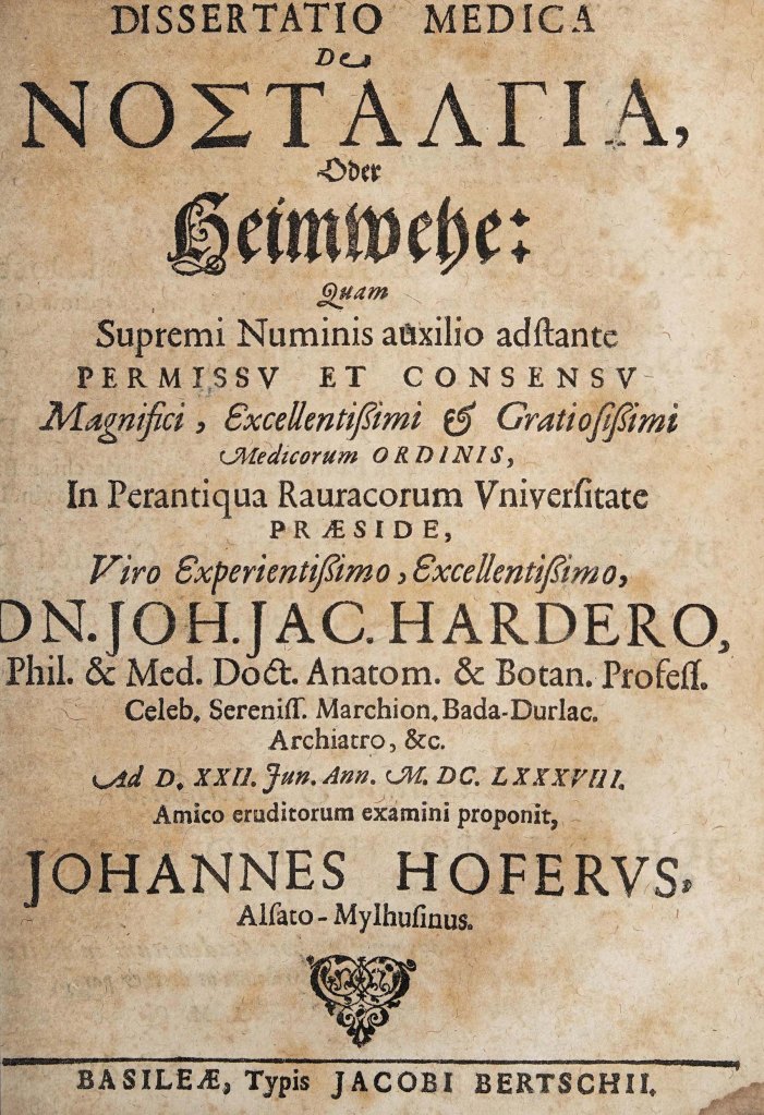 Cuvântul nostalgie își are originea în greaca veche, fiind un compus din νόστος („întoarcere acasă”) și ἄλγος („durere”), echivalentul său nefiind atestat ca termen de sine stătător (*νοσταλγία). A intrat în limbile moderne din termenul neolatin nostalgia, inventat în anul 1688 de către elvețianul Johannes Hofer, un student la medicină, care l-a utilizat pentru prima dată ca termen medical pentru a descrie sentimentul de dor de casă, de familie, de cei dragi simțit de soldații plecați pe front. Însă, indiferent de momentul născocirii cuvântului, sentimentul în sine a apărut de-a lungul epocilor, fiind simțit, într-o formă sau alta, de foarte mulți oameni.