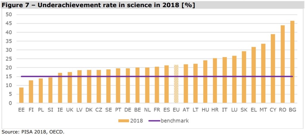La testele PISA din 2018, (ultimele publicate, rezultatele testelor PISA din anul 2022 urmând a fi publicate, conform anunțului oficial, la data de 5 decembrie 2023)[1] elevii români s-au situat, după cum știm, pe ultimele locuri între țările europene. Ultimul loc la matematică, cu o rată de eșec de 45%, penultimul loc la științe, cu o rată de eșec de 44% și antepenultiumul loc la citire, cu o rată de eșec de 40%. Din păcate, rezultatele s-au înrăutățit, comparativ cu anul 2015, cu aproape 6% pentru științe, cu 2% pentru citire, și cu peste 6% pentru matematică. Rezultatele obținute de toate țările europene se regăsesc în graficele de mai jos:
