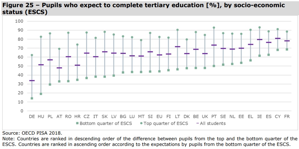 În graficul de mai sus[4] este prezentată corelația dintre statutul socio-economic al familiilor și dorința copiilor de a urma studii superioare. Dorința este mai ridicată printre copii care provin din familii înstărite, la nivel european peste 80% dintre copiii acestor familii dorind să urmeze studii superioare. În cazul copiilor mai puțin înstăriți, procentul variază de la puțin peste 10% (Germania), la aproape 70% (Franța). În cazul României aproape 90% dintre copiii ce provin din familii înstărite doresc să urmeze studii universitare, în timp ce din familiile cel mai puțin înstărite procentul depășește puțin peste 30%. După cum remarcă autorii analizei, în acest caz discrepanța cea mai mare se regăsește în cazul copiilor ce aparțin țărilor estice: „This difference is highest in some Central and Eastern countries: Hungary (64.0 percentage points), Poland (57.2 percentage points), Romania (54.2 percentage points), Czechia (50.8 percentage points) and Slovakia (50.1 percentage points).” (p. 26) O aparentă anomalie, care nu ne este explicată, o găsim în cazul Germaniei, unde dorința de a urma studii superioare este scăzută, atât printre copiii înstăriți (puțin peste 60% – cel mai mic procent la nivel european!), cât și printre cei care provin din familii sărace (puțin peste 10%). Aceste aspirații nu cadrează totuși cu realitatea educațională din Germania, unde ponderea absolvenților de studii superioare nu este nicidecum cea mai redusă din Europa!