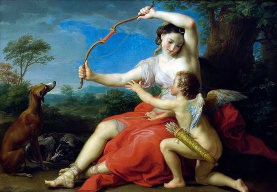 Față de săgețile zeiței vânătorii, cele ale lui Eros nu dor și nu-l răpun pe cel atins chiar de la început. Ele rănesc abia după ce trece efectul îndrăgostirii sau când apare dorul. Căci nu este o coincidență etimologică faptul că dorul doare (au o rădăcină comună: de la dolere, „a durea”). Culmea este că dorul, după ce e înlăturat, tinde să stingă și fiorul iubirii. Ceea ce ne creează un alt fel de durere; și mai odioasă. Iată în ce fel de periculoase sunt săgețile aparent inocentului dar iresponsabilului Eros. Cel puțin, de la un atac al Artemisei știm la ce să ne așteptăm. Și bine face zeița vânătorii că încearcă să-l țină departe de arc pe zeul cel nărăvaș, după cum sugerează pictorul italian Pompeo Batoni în tabloul din 1761.