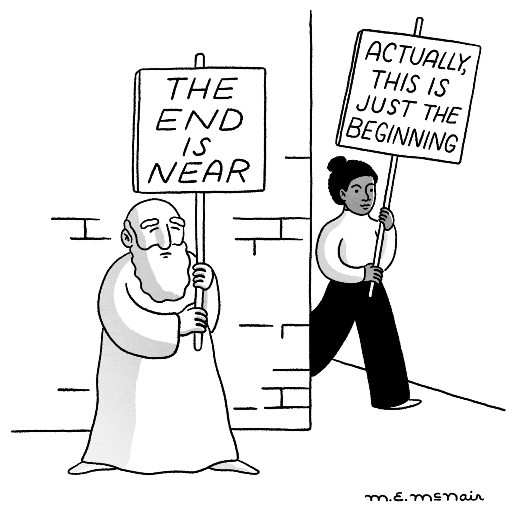 În pofida a ceea ce aminteam mai sus, cel puțin ideea sfârșitului care aduce un nou început este intrinsecă și creștinismului. Ce altceva este Apocalipsa dacă nu un moment profund regenerator? Desigur, creștinii nerăbdători de diverse confesiuni l-au „trăit” deja de câteva ori în ultimul mileniu, fără prea mult succes. Într-un sens laic, ca remediu, psihologia populară și unele psihoterapii au asimilat ideile creștine și pe cele filosofice grecești despre finalitate mai mult ca final fericit. Indiferent ce (ți) se întâmplă, totul este bine: „când o poartă a fericirii se închide, o alta se deschide”, „tot răul spre bine”, „fără trauma din copilărie nu ai fi devenit persoana valoroasă de astăzi”, „privește partea luminoasă a lucrurilor”, „roata se învârte”, „va răsări soarele și pe strada ta” și altele asemenea. Aceste panseuri au bineînțeles un rol consolator și, atât timp cât nu sunt predominante în activitatea de consiliere, pot avea un efect benefic. Luate ca remediu exclusiv devin toxice. În momentul în care gândirea deziderativă domină gândirea critică vorbim de o gândire derizorie, care macină în gol nimicul la care se referea Aristotel: ceea-ce-este [doar] în posibilitate. Dar oare am putea infera același lucru despre următoarea extincție în masă? Poate doar cu privire la timpul când va veni, nu și la spațiu.