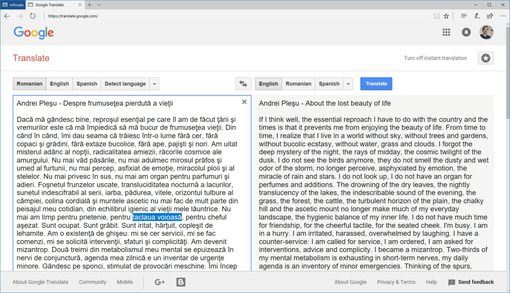 Dacă pornim (ceea ce vă și recomand instant) Google Translate și îi dăm (prin ‘copy & paste’) un text să-l traducă dintr-o limbă în alta, și în special dacă îl mai și supra-solicităm prin modificarea pe loc a cuvintelor din textul sursă (panoul din stânga), vom vedea pe viu manifestări de inteligență: observăm că textul rezultat prin traducere nu este deloc rezultatul unui simple corespondențe de dicționar, ci fiecare cuvânt este corelat cu (și respectiv actualizat în funcție de) cele din vecinătate, iar propozițiile și frazele sunt reevaluate în mod dinamic. Ce mai! Se simte că aplicația evaluează în mod continuu funcțiile sintactice ale cuvintelor, și că lucrează permanent cu ceva reguli de frazeologie și de semantică. Ceea ce îi cam dă dreptul la denominarea de ‘inteligență artificială’. Nu știm cum de Google Translate învață singur regulile, așa cum ar denota sitagma ‘machine learning’, însă într-un viitor nu foarte îndepărtat (când va avea în spate suficientă putere de stocare și de procesare) va putea aplica mai toate regulile din mai toate limbile lumii. În fond, și inteligența umană este o chestiune de cantitate: abilitățile creierului se datorează imensei mulțimi de celule neuronale și de sinapse legându-le. Doar că artificialul mai are mult până să ajungă la miniaturizarea și la eficiența energetică specifice biologicului.